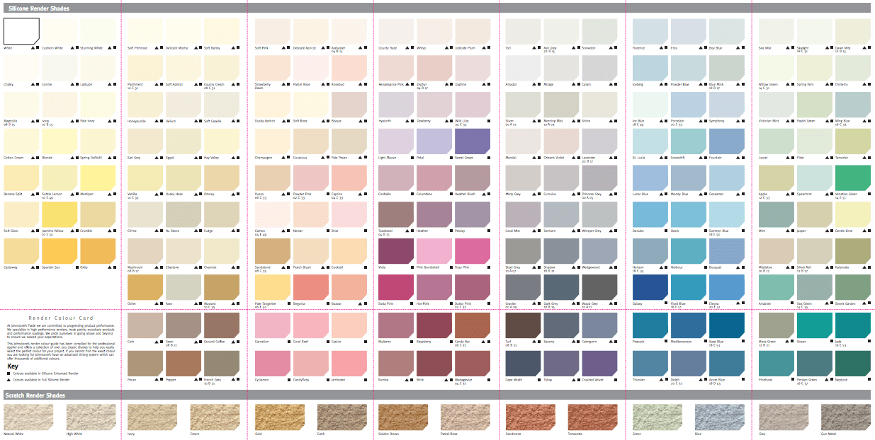 Acrylic Render is a polymer modified, thin-coat render which comes pre-mixed (ready to use) in a wide variety of colours, used as a decorative finish to the basecoat. Acrylic render is available in four grain sizes: 1.0mm, 1.5mm, 2.0mm and 3.0mm. Acrylic Render is suitable for interior and exterior surfaces.